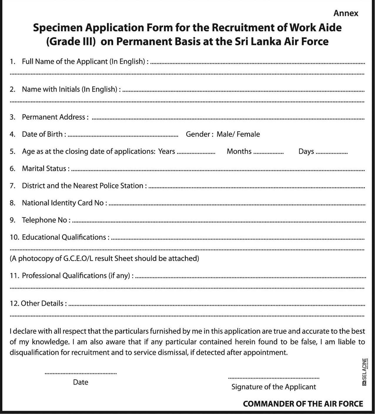 Post of Work Aide (Grade III) – Sri Lanka Air Force – Sri Lanka Air Force, Sri Jayawardenepura, Kotte